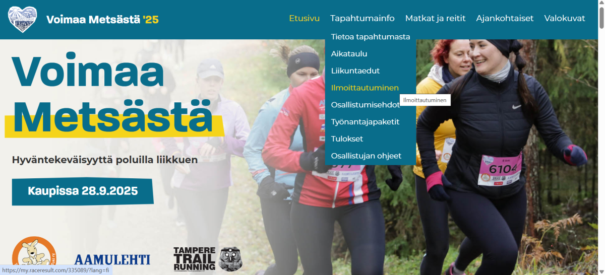 2. Siirrä hiiri ylävalikon “tapahtumainfo” kohtaan, mutta älä klikkaa vielä. Näin avautuu alavalikko josta klikkaa kohtaa “ilmoittautuminen”.