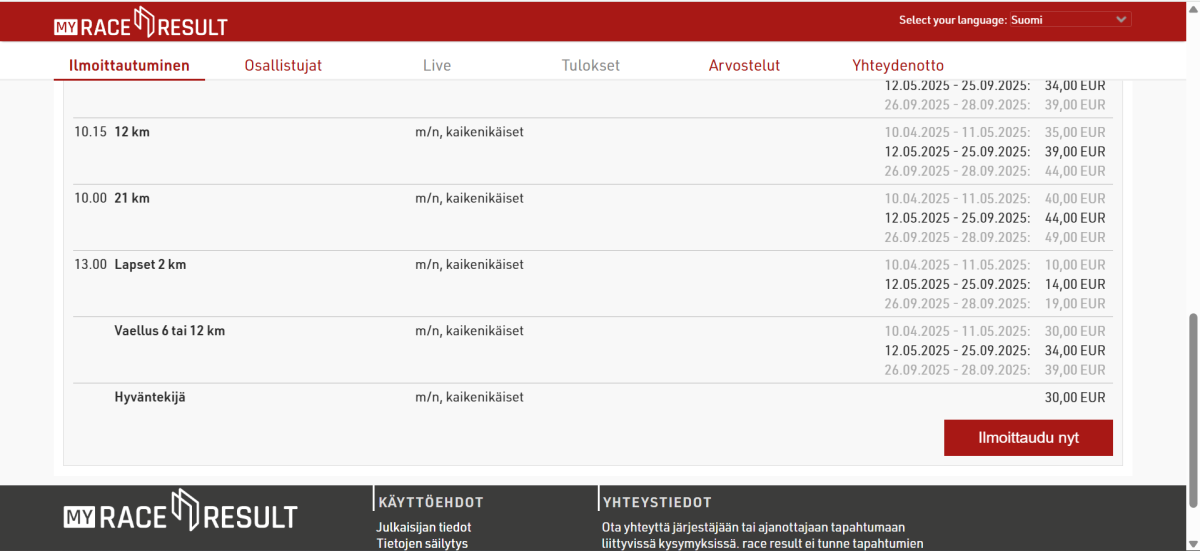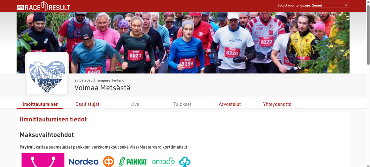 3. Tämän jälkeen aukeaa My Race Result ilmoittautumissivu.