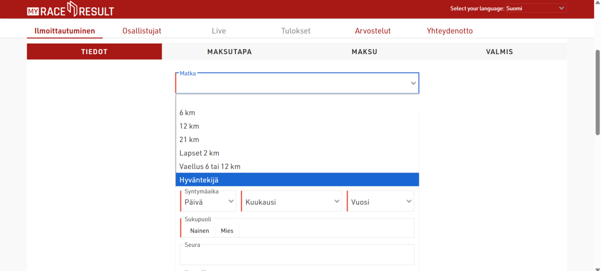 6. Aukeaa “tiedot” välilehti. Valitse matkan kohtaan “hyväntekijä”. Tämän jälkeen voit vain täyttää tiedot ja tehdä ilmoittautumisen loppuun!